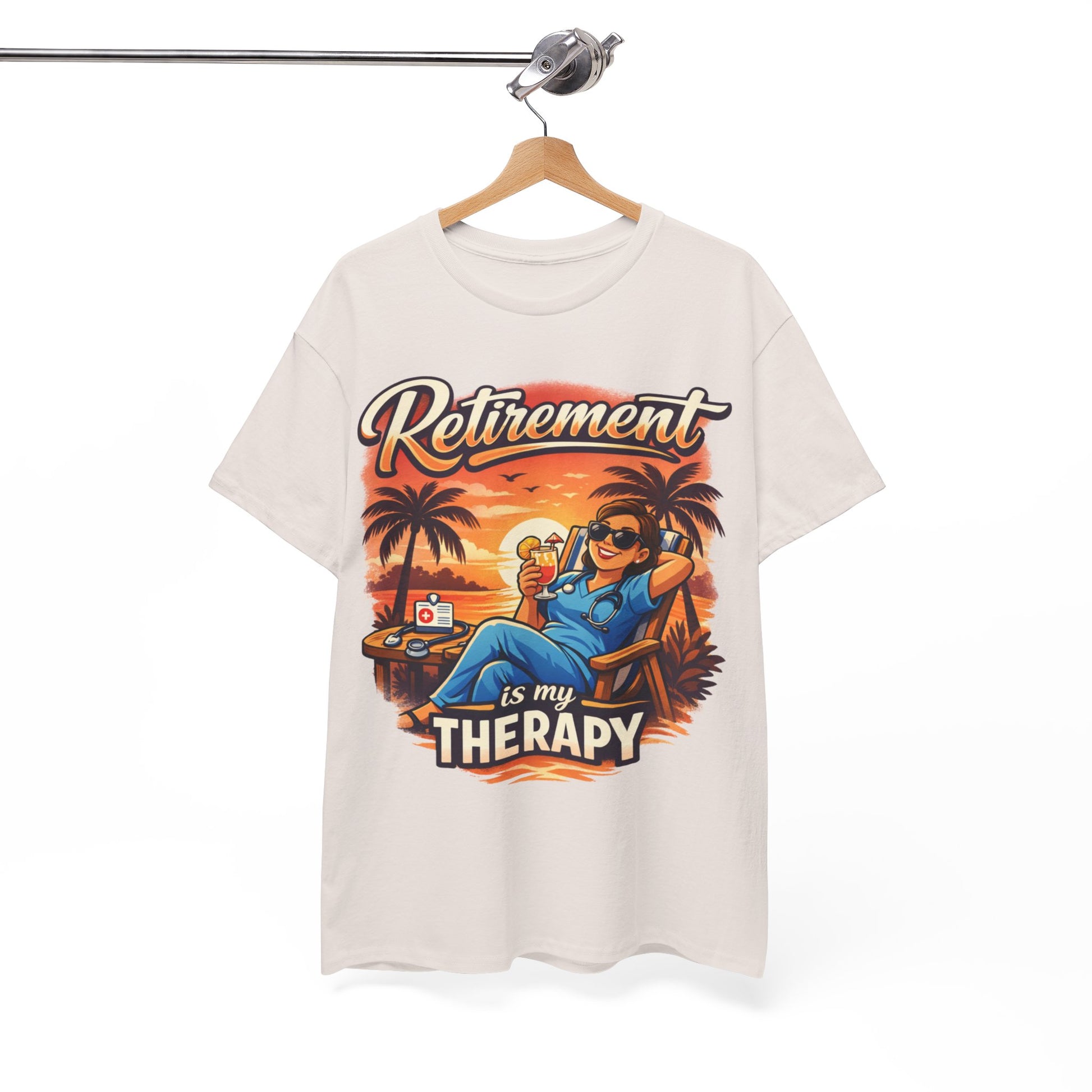 Sink into slow afternoons and warm sunsets. This relaxed tee wears like a pause button — soft, breathable cotton with a vintage-inspired print that reads: Retirement is my therapy. The design shows a laid-back retiree, sunglasses, cold drink and a palm-fringed horizon, bringing beachside calm to backyard barbecues, weekend drives, and quiet mornings on the porch. It’s built to last: smooth, medium-weight fabric that holds color and shape, a ribbed collar that keeps its form, and a tear-away label for itch-free comfort. Wear it while you swap stories with old friends, celebrate a milestone, or simply lean back and enjoy the small, slow pleasures of retired life.